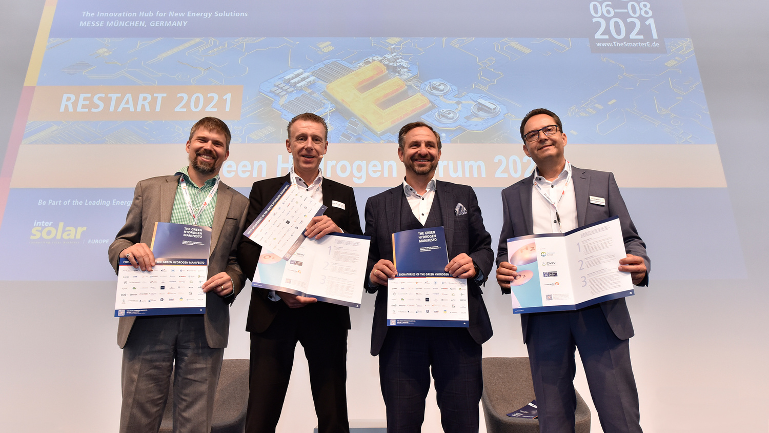 Presentation of “The Green Hydrogen Manifesto”. Olivier Bucheli (President, European Electrolyzer and Fuel Cell Forum EFCF), Werner Diwald (Chairman of the Board, German Hydrogen and Fuel Cell Association DMV), Jorgo Chatzimarkakis (CEO, Hydrogen Europe) and Markus Elsässer (CEO, Solar Promotion GmbH) (from left to right).